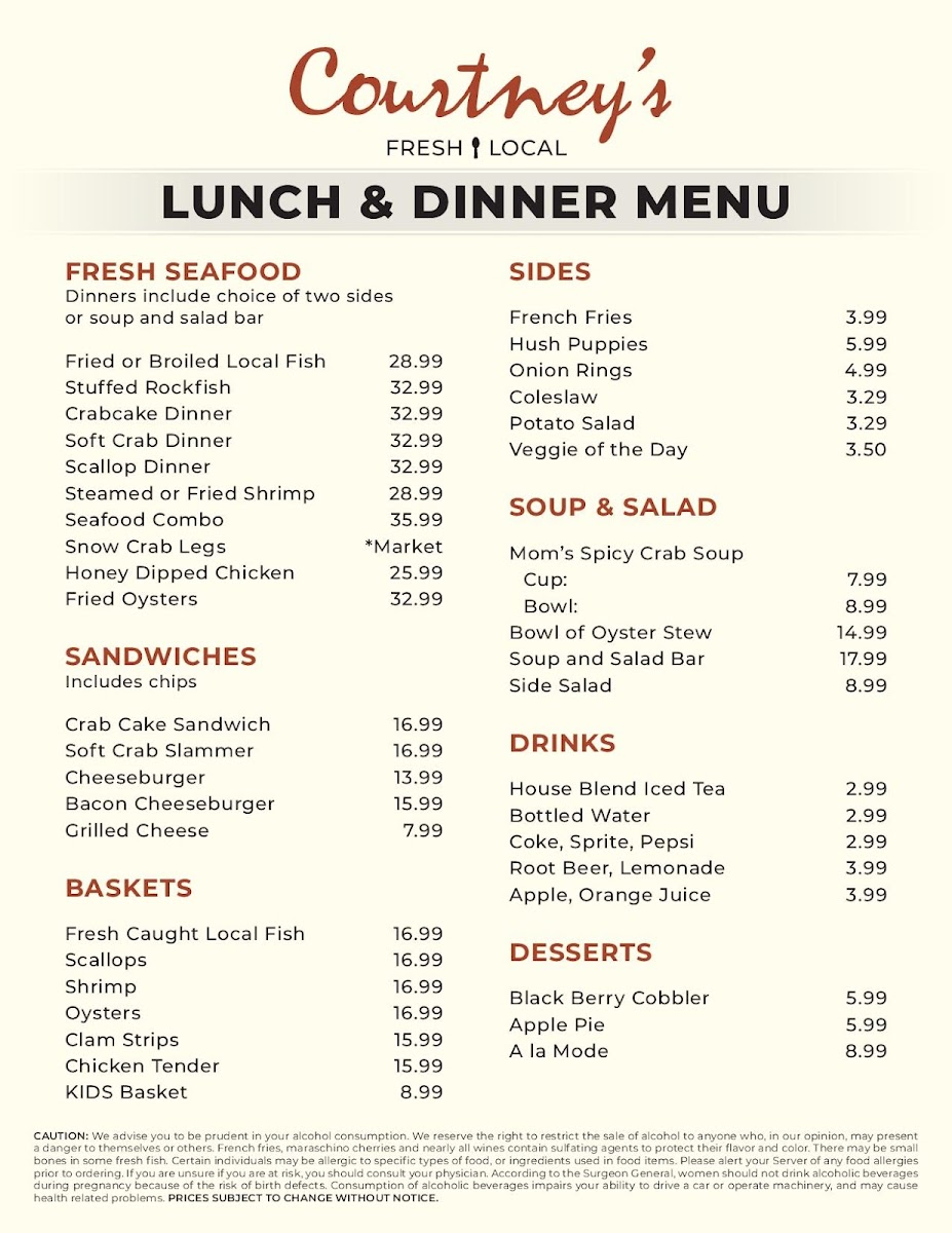 Welcome to Courtney's Restaurant-Seafood, a hidden gem located at 48290 Wynne Rd, Ridge, MD. Renowned for its fresh, delectable seafood, this cozy eatery invites you to savor traditional Maryland flavors. The menu highlights include mouthwatering stuffed rockfish, praised by diners for its perfect execution, and broiled fish platters that showcase the freshness of local catches. Guests rave about the well-balanced cocktails, such as the zesty Orange Crush and the bold spiced margarita, which pair wonderfully with meals. Don't miss the crispy onion rings and the warm, homemade blackberry cobbler topped with vanilla ice cream, a sweet finale that receives applause from all. The inviting atmosphere, friendly staff, and stunning bay views create a memorable dining experience. Whether you seek a casual lunch or a cozy dinner, Courtney's promises a satisfying seafood feast that captures the essence of Maryland's culinary heritage.
